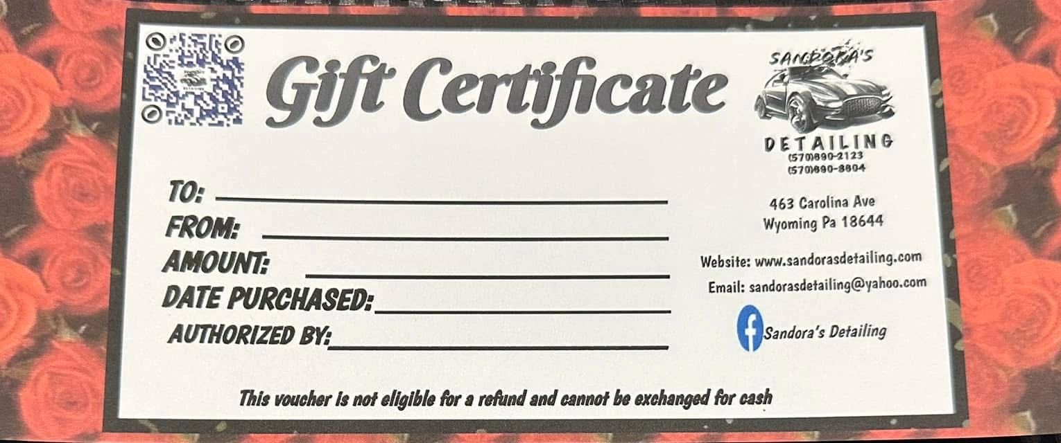 Make someone's day with a Sandoras Detailing gift card. It's the perfect present for anyone who loves a clean car!